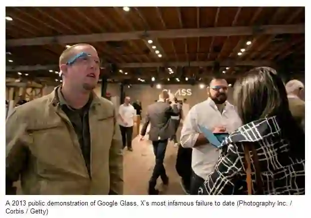 在X,没有哪个失败的案例比Google Glass更有名了,它是一款外观酷似眼镜的头戴式可穿戴电脑。外界对Google Glass一直诟病甚多。Glass其实在一开始是被定位为继手机之后最伟大的下一代智能设备的,它起来与正常的眼镜非常相似。并且更多的,它的免提设计是为了将人类从屏幕设备上解放,从而实现智能世界与人类真实世界的无缝连接。(批判地来说,它其实是一个新的策略,是为了更好的推广Google Ads,使其更接近人类的视野。)在2013年一次规模庞大的发布会之后(甚至在Vogue上有一篇长达12页的推广介绍),消费者几乎全面抵制这个产品,认为其奇怪并毫无意义。最终还背上了一个“Glassholes”(眼镜黑洞)的骂名。