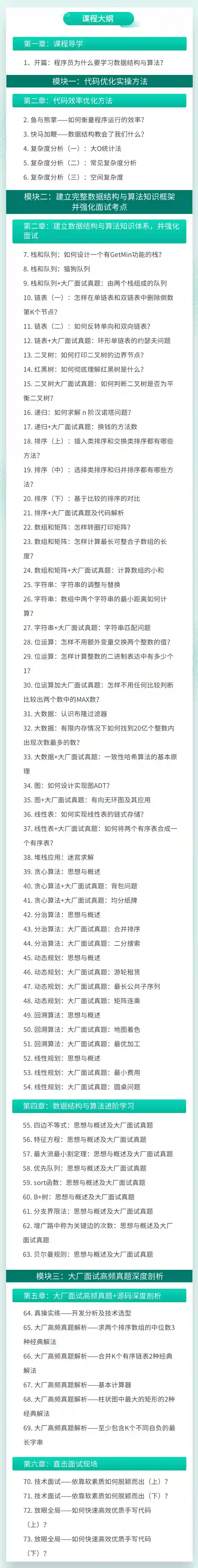我将带你掌握 30 个数据结构与算法原理,并通过实战让你掌握其内核,最后再解读大厂高频面试真题。让你在工作、求职中遇到算法相关问题时都能灵活应对!