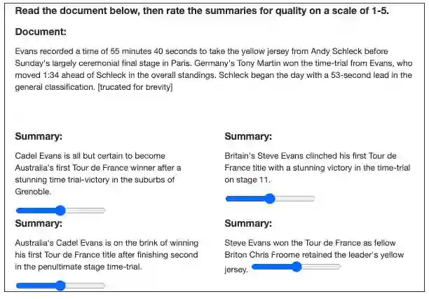 在不透露摘要来源的前提下,评分人对模型生成的摘要与人工编写的摘要进行比较并打分,以上为示例图,评分者能够看到完整文本