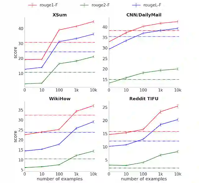 ROUGE 得分(三种变体,分数越高越好)对比四个所选摘要数据集中监督示例的数量虚线表示 Transformer 编码器-解码器没有预训练时,使用全监督的性能