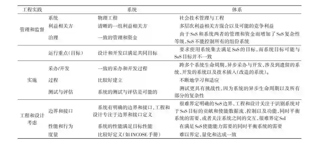 体系是一个具有资源池、面向特定任务系统集合或者专门的系统集,它们的能力整合在一起创造一个新的、更复杂的系统,提供比简单的组份系统的总和还要多的功能和性能。体系与独立的或者有组织的系统之间存在一些差异(表 1)。但是这些差异并不是如表1中所描述的那样非黑即白。在每一种情况下,不同的实践、系统的复杂性以及系统开发环境的变化——某些SoS的特征也可能适用于某些特定情况下的系统。