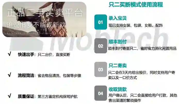 “先买断,再销售”,只二采取的买断模式一站式解决人们解决了其清除闲置物 品的如清理、拍摄、上架、销售等其他琐事,模式本身对消费者更为便利,同时 只二引入第三方鉴定机构,提供售前-售中-售后三位一体的质量把控