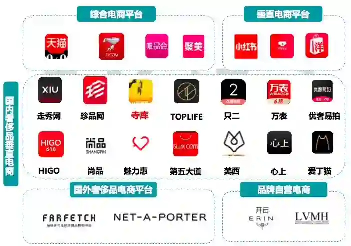 当前综合电商平台如天猫、京东,垂直电商平台如小红书、洋码头等均涉猎奢侈 品销售,奢侈品垂直电商主要以商品出售、二手买卖、奢侈品鉴定等业务为主, 体量均不大,寺库在其中优势明显。
