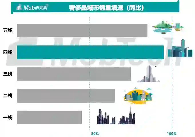 虽然一二线城市贡献了过半的奢侈品市场,但是下沉市场(三线以下地区)在销 量增速上遥遥领先,具有更大发展潜力,特别是奢侈品牌没有开设门店的地区, 空间巨大