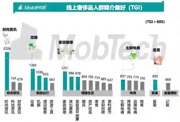 奢侈品消费者更关注综合资讯、旅游出行、便捷生活、电商、医美等移动媒介App,尤其在综合资讯类、攻略类、机票类、家居装修类、生鲜电商类表现的较 为明显