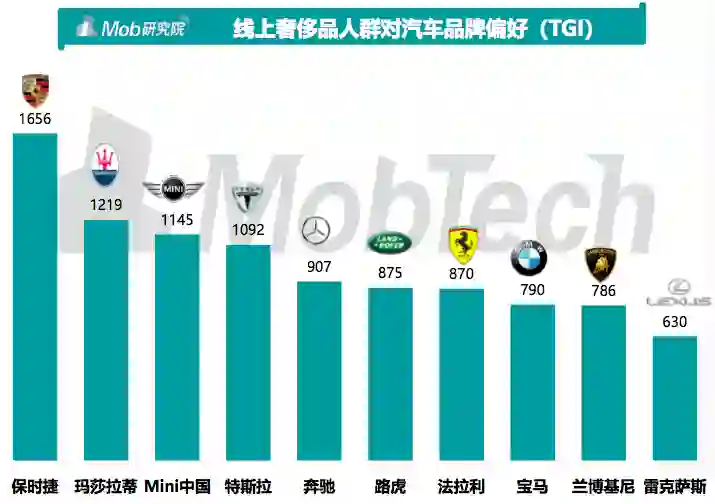 奢侈品人群更加关注高端车、豪华车品牌,在兴趣偏好上保时捷、玛莎拉蒂、Mini中国、特斯拉等品牌关注比例最高