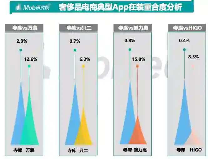 头部App寺库和其余四家在装重合度较低,用户多只安装一种奢侈品电商平台App,奢侈品电商平台的竞争已走出差异化路线。