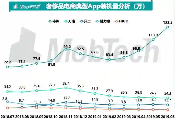 装机量方面,寺库以绝对优势领先,且增长较快,万表在装量在30万左右,位列 其后。除寺库外,其余四家平台在装量均未突破百万量级。