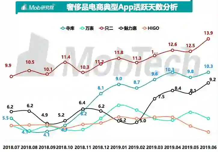 平均活跃天数方面,只二用户粘性表现较好,用户月活跃天数高达13.9天,而寺 库的平均活跃天数则紧随其后,已达10.3天。