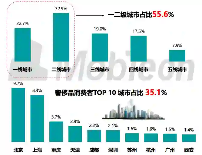 超过50%的奢侈品消费者分布在一二线高级别城市,北京上海成为大本营,前十 大城市消费者占比超过35%