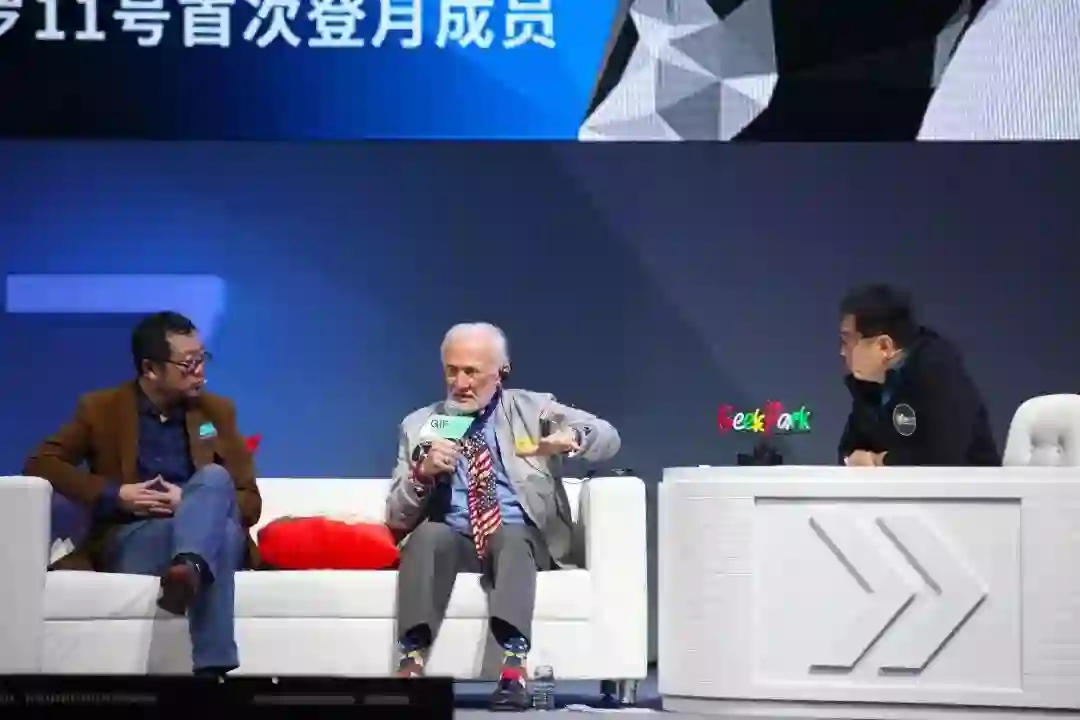 2017 年,科幻作家刘慈欣(左一)、阿波罗 11 号人类首次登月宇航员 Buzz Aldrin(左二)与张鹏在 GeekPark IF