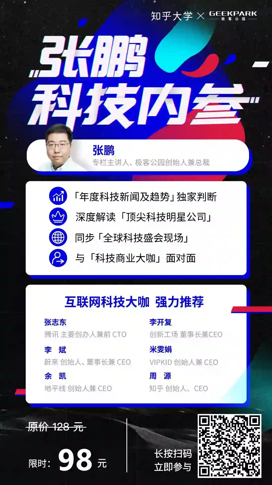 这次知乎大学联合极客公园推出的私家课《张鹏科技内参》,张鹏说是想把自己 20 年来对科技行业的观察思考以及和国内外众多企业家交流产生的思想火花,用音频的形式分享给更多人。我其实比较期待他把平时私下讲的很多新闻时评和观点,甚至一些媒体不知道的问题真相能讲出来。虽然他平时说的观点我也不是都同意,但他说这个栏目是为了「推动大家养成追求独立思维」这件事,我举双手赞同。