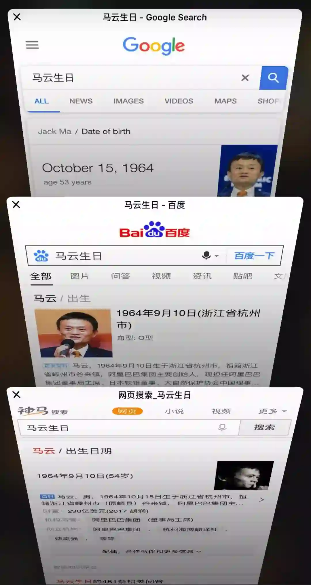 Google、百度和神马搜索上的马云生日