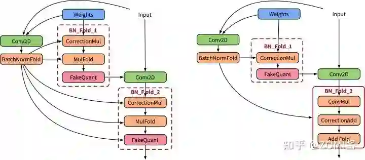 图中主要注意的点为BN_Fold_1和BN_Fold_2,其中BN_Fold_1的作用有两个:拆分融合的BN层对weight的影响,和对权重数据进行校正;BN_Fold_2的作用有两个:拆分融合的BN层对bias的作用影响,和对bias数据进行校正。