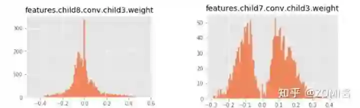 前面呢,曾经提到一般而言,权重数据是对称,为了可以进一步减少数据的计算,较少额外的存储数据,因此推荐使用对称的量化算法。但是在对mobieNetV2,mobileNetV3的实际测试开发的过程中,发现数据大部分是有偏的,例如mobileNetV2中: