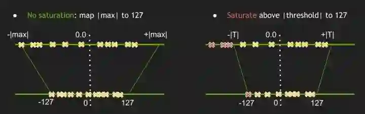 确定了scale之后,itn8数据对应的表示范围为 ,量化操作即为对待量化数据以 进行饱和式截断,即超过范围的数据饱和到边界值,然后进行第一条公式所示量化计算即可。