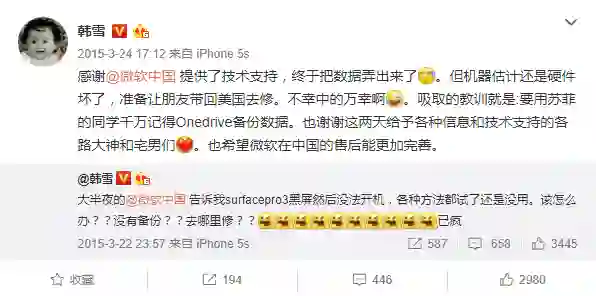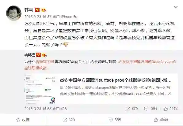 2015年的时候,美国《消费者报告》发布公告称,微软 Surface故障率高达 20%,而这时,微软中国却单方面取消了Surface Pro 3的全球联保政策,并且不接受付费维修,让消费者的利益受到极大侵害。韩雪恰巧曾购入过一台Surface Pro 3,不过不幸的是,很快电脑便黑屏开不了机,数据也没有备份。愤怒的韩雪自然转了一条微软出尔反尔的新闻。