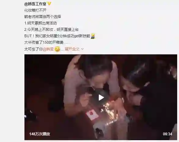 上个月,韩雪工作室在微博上更出一个视频,并发文称:“用五分钟就省了150块的开箱费,韩老师太可怕了!”