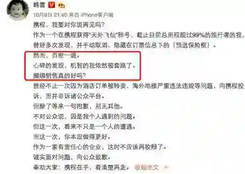 10 月 9 号晚上,韩雪发的一条微博在网络上引起了轩然大波。在微博中,她大力炮轰携程的种种恶劣行为:捆绑销售、酒店订单转售、海外地接违法违规等。