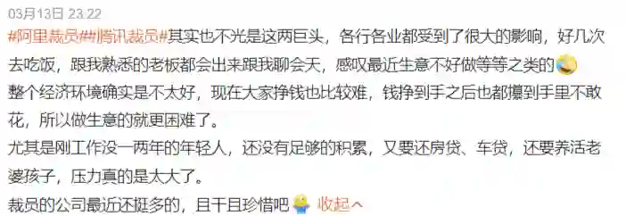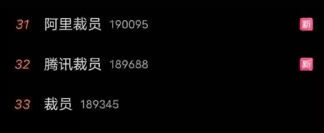 近日,阿里、腾讯裁员集体冲上微博热搜,「阿里裁员」、「腾讯裁员」与「裁员」话题热度升至19万。