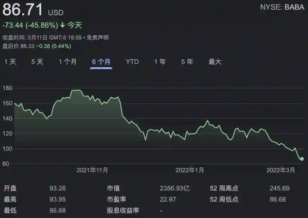 阿里最新股票信息显示,即便是和去年10月并不算高的每股177美元相比,阿里的股票在不足半年时间就已经面临「拦腰斩」,只剩下不到87美元,足足打了个对折。
