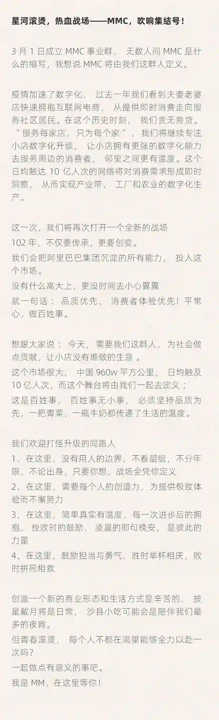 在去年4月1日,阿里内网发布全员公开信《MMC,吹响集结号!》,将MMC定位为「服务每家店,只为每个家」。