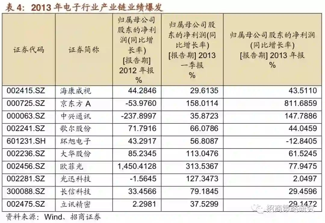 其实,如果有对电子行业跟踪紧密的投资者知道,2012年下半年是智能手机非常重要的拐点,IPHONE革命性产品IPHONE 3Gs在2008发布后,已经带领着智能手机的渗透率不断提升。国内方面,模仿者和新进入者不断增多,2012年下半年,竟然有高达1400款产品发布,智能手机迎来了春天。智能手机的销量爆发使得零部件厂商业业绩飞涨。智能手机销量爆发,3G网络的普及,以及随后2013年11月发布4G牌照,正式进入4G时代。也有人把2013年看成是移动互联网的元年。除此之外,国内安防建设开始加速。安防、消费电子和通讯设备,成为一季报的电子行业的三驾马车。也构成了2013年-2015年TMT板块的牛市基础。