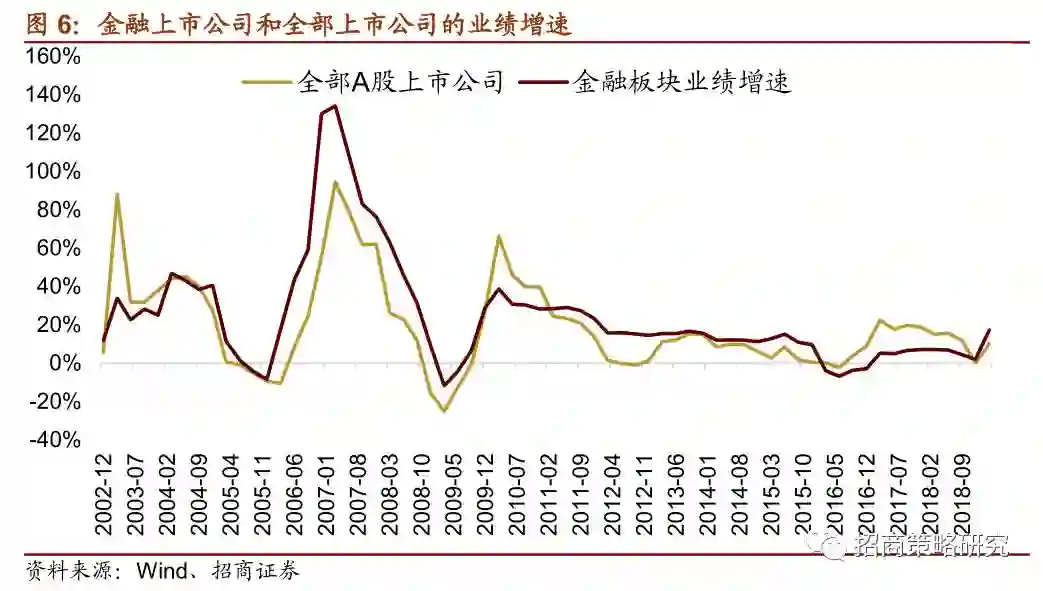 伴随这信贷扩张,以及股票市场的大牛市,金融板块业绩增速在2006-2007年实现了翻倍增长。2006-2008年,金融板块业绩要明显好于上市公司整体。