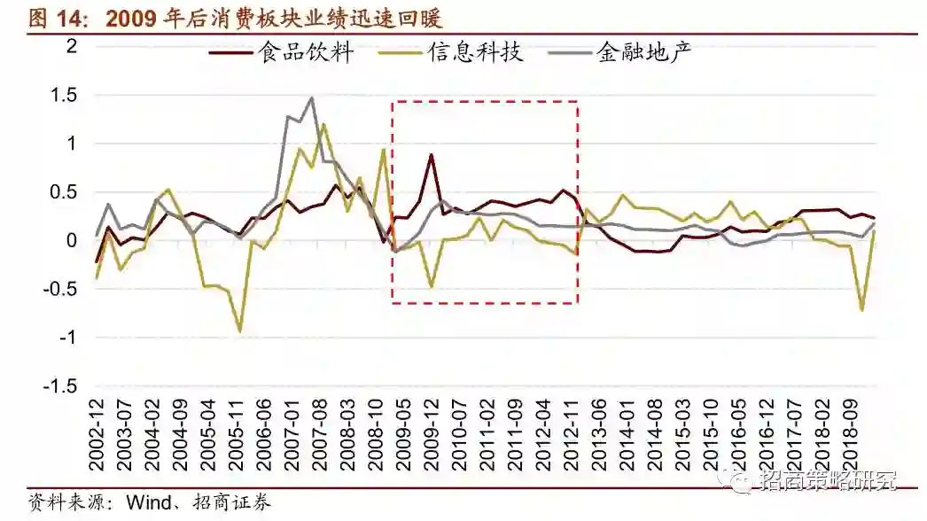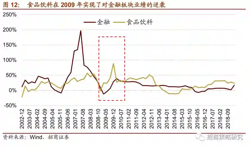 随后的事态发展超出了大家的预期,消费板块不仅是业绩最早复苏,而且在2009-2012年长达四年左右的时间,企业排名始终是前二的板块,大家期待的金融板块业绩爆发也只是昙花一现。消费还是那个增速的消费,但是金融已经不再那个高增长的金融了。因此,回过头来看,2009年三季度成为消费板块超额收益的起点。