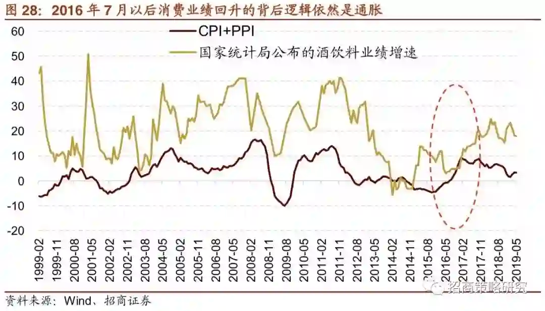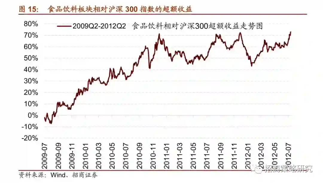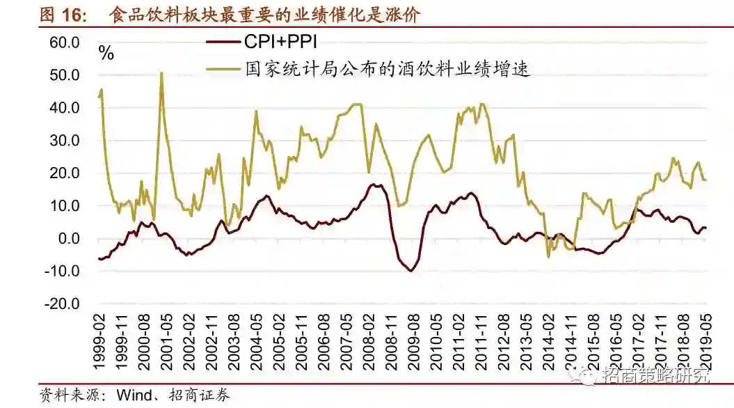 当我们事后来看,食品饮料板块最重要的业绩催化,就是涨价。如果我们将CPI+PPI与国家统计局公布的酒、饮料的利润增速画在一张图上,这种相关性就非常明显。无论是PPI上涨(原材料涨价)、还是CPI上涨(消费涨价)都会使得以白酒为代表的消费品有提价的动力,而且高通胀环境下,提价会比较顺利。因此,食品饮料板块的业绩高点均是出现在CPI+PPI比较高的时候。这个投资逻辑现在已经为投资者所熟知,但是站在2009年,大家仍然需要有一个接受的过程。