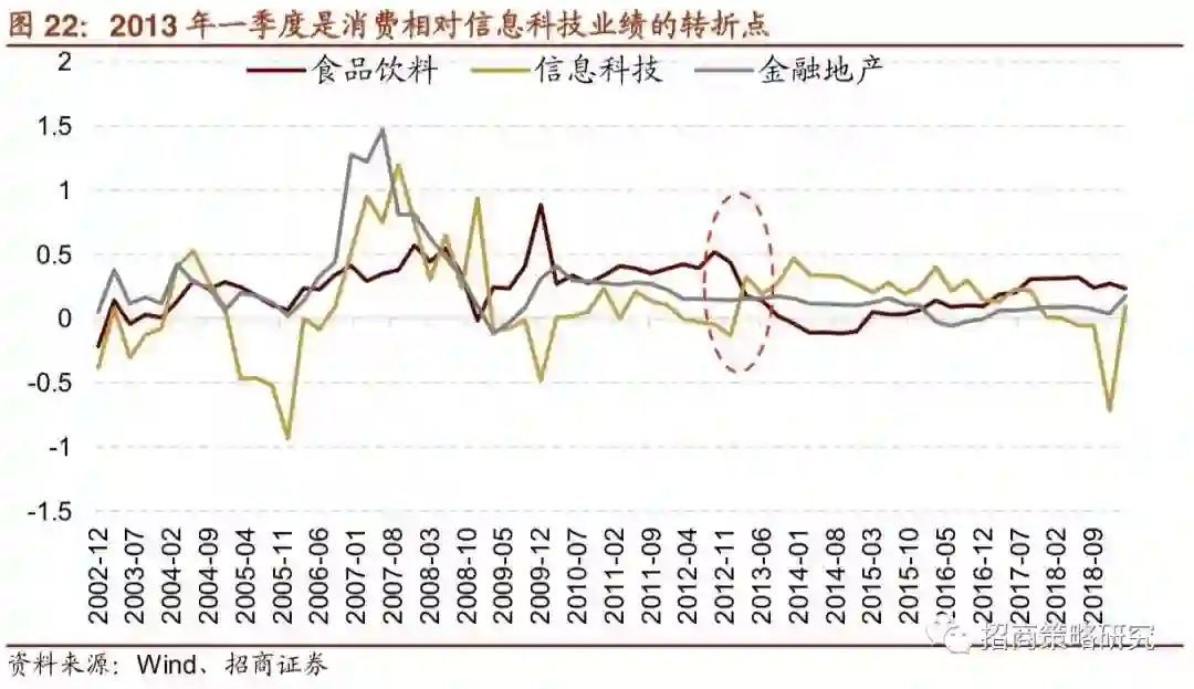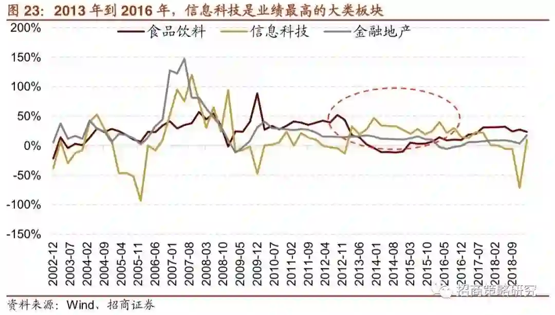 从下图我们看的非常清楚,2012年四季度成为食品饮料为代表的消费板块的业绩拐点,自2009年到2012年长达四年的业绩优势消失。这时,信息科技板块开始崛起了。