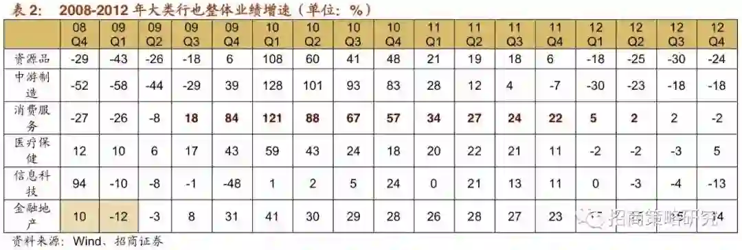 2009年开始情况开始起变化,虽然信贷出现天量,让大家习惯性的去加仓金融,但是一个季度一个季度过去了,这一次好像情况有些变化,而金融板块业绩却未如预期大涨,反而是消费板块业绩迅速回暖,成为为2009年之后业绩增速最快的板块。