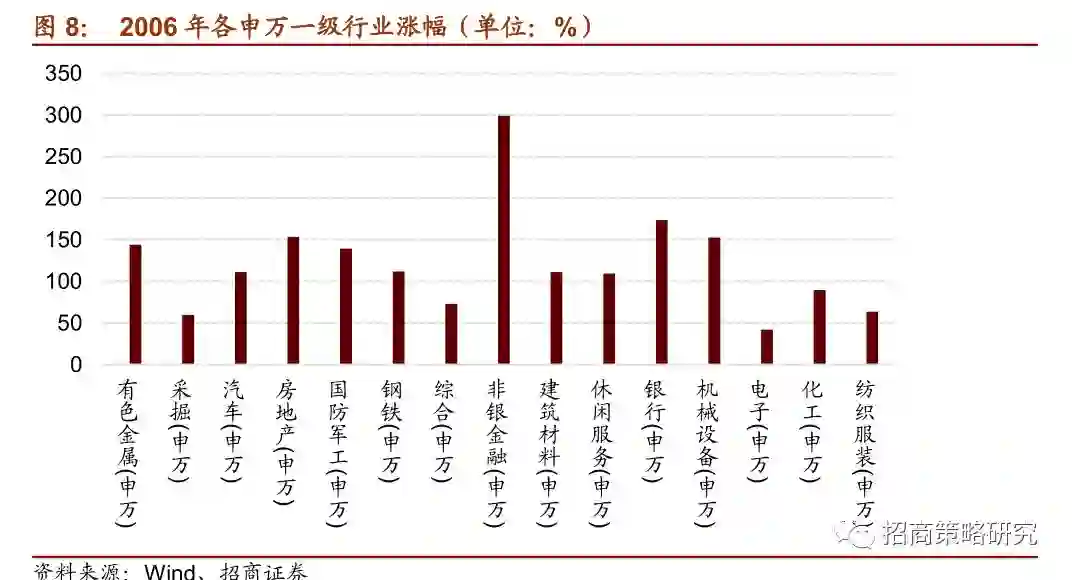 2006年,随着金融大幅扩张,非银金融以300%的涨幅领涨所有板块,其次是银行,那些年,银行和券商都是炙手可热的成长股。金融板块在2006年的大涨坚定了机构持仓的信念,公募基金在2006年年底对金融板块的持仓高达40%。