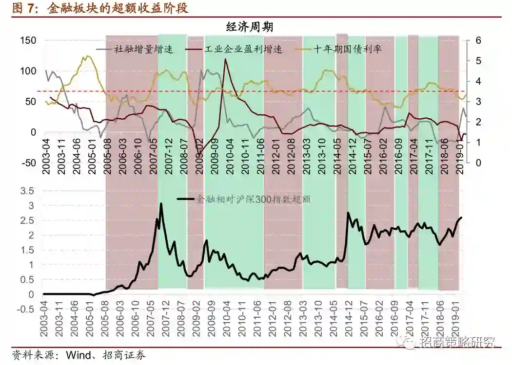 后来,投资者逐渐总结出规律,就是金融宽松先买金融。我们进行了总结,从十年期国债利率从上往下击穿3.5%,至社融增速回升,也就是我们称之为金融宽松周期阶段,金融板块相对大盘有超额收益。