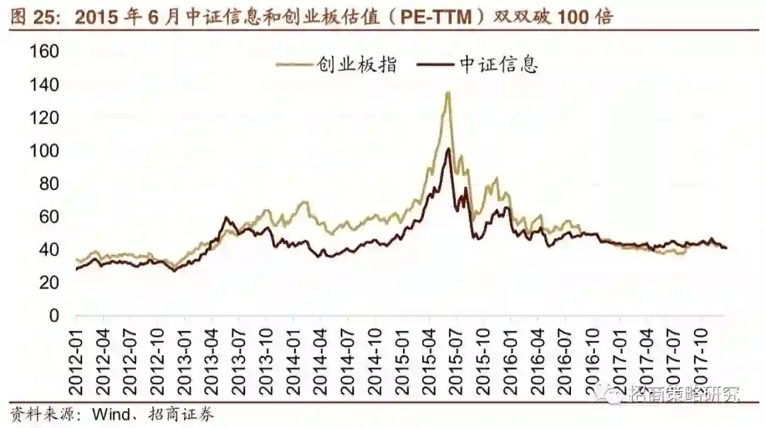 公募基金、私募基金、融资余额在2015年上半年实现了共振,疯狂买入各种信息科技股票,有申购认购就加仓原来的重仓股,中证信息指数在2015年的上半年,涨幅高达147%,创业板指更是从1000点左右,涨到4000点,涨幅达到4倍。而估值双双突破了100倍。