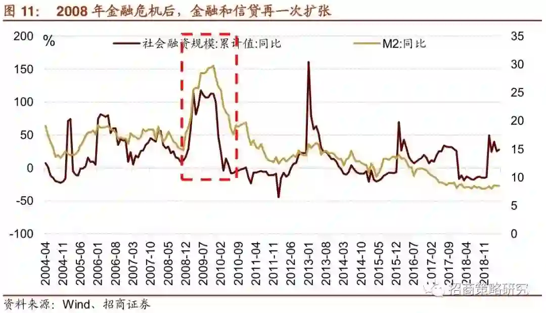 正当对金融板块的抱团要全面瓦解时,2008年11月,“四万亿”投资计划横空出世;这么多项目要投,那必然是金融和信贷的再一次扩张。