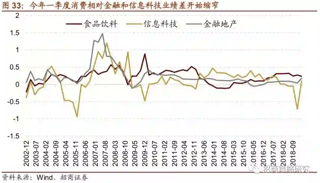 从过去几个季度消费(以食品饮料为代表),信息科技和金融地产相对业绩比较来看,食品饮料板块依然是最高的,金融板块在一季度市场大涨背景下,业绩有所改善,而信息科技板块同比业绩也有所改善。消费相对金融和信息科技的业绩差已经开始缩窄。