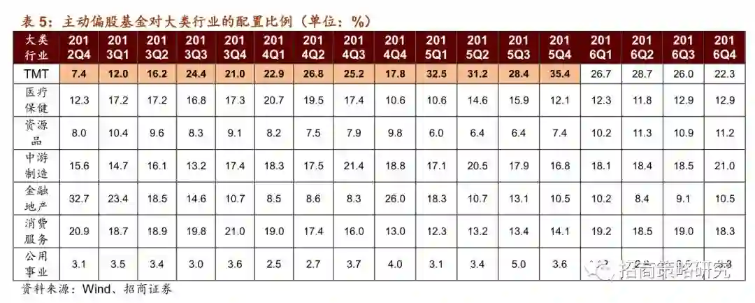2015年7月开始,A股出现了明显调整并触发了一些风险,政府部门采取了一些稳定措施,调整持续了一个季度,一直到9月底,由于跌幅快速并且巨大,大部分机构投资者都来不及减仓,到了9月底,当市场终于企稳时,大家的第一反应当然是加仓跌幅巨大的信息科技,到2015年四季度,前面还在犹豫不决的投资者抓住了最后的机会,赶紧加仓,公募基金对信息科技板块持仓达到35.43%,创下了历史新高。