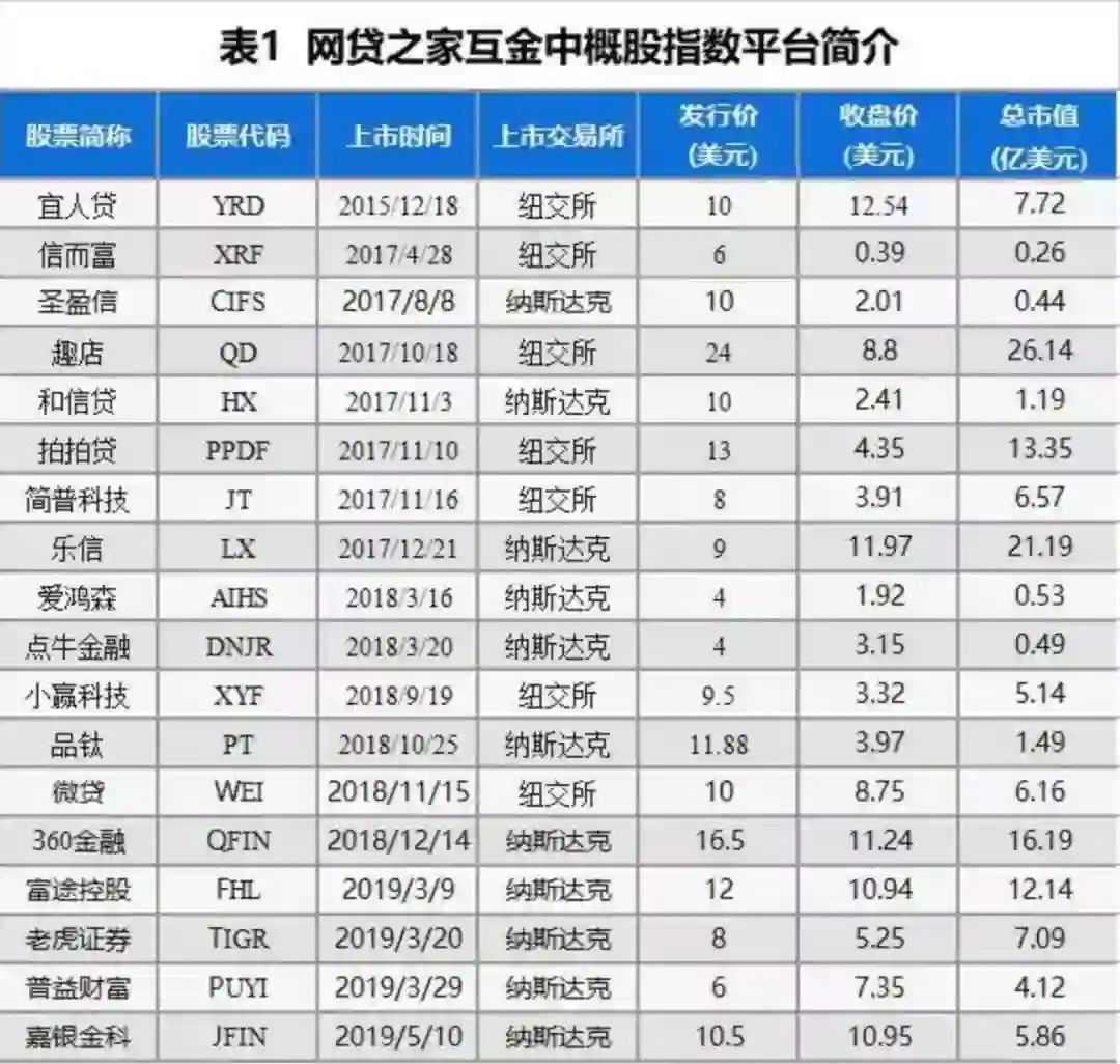(图片来源:网贷之家。表为18家在美上市的互联网金融企业2019年7月10日的收盘价。)