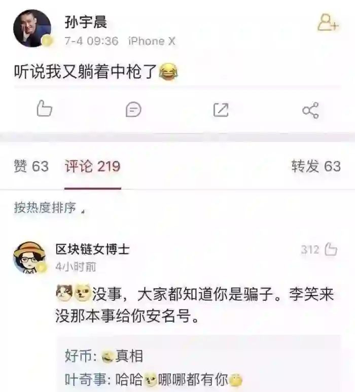 当时,孙宇晨微博称“听说我又躺着中枪了”。而热门评论中网友“区块链女博士”回复:“没事,大家都知道你是骗子。李笑来没那本事给你安名号。”得到许多网友点赞。