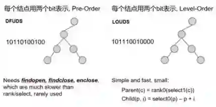 Succinct Data Structure是一种能够在接近于信息论下限的空间内来表达对象的技术,通常使用位图来表示,用位图上的rank和select来定位。