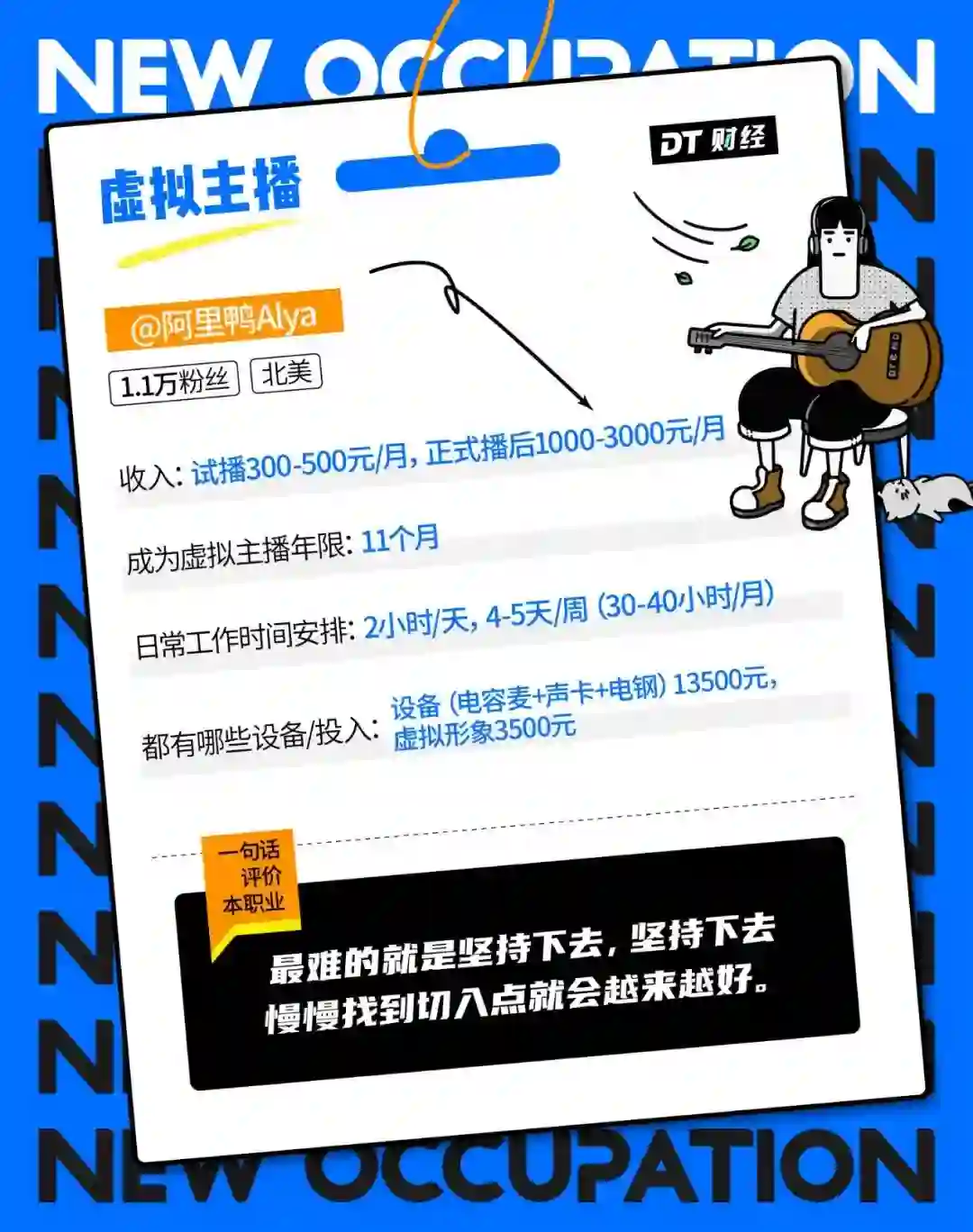 如果真人出镜,可能就会对本职工作有影响。而阿里鸭在“互联网工作,肯定比做音乐赚得多。”“就算是B站整个虚拟主播市场,体量也非常小,而头部虚拟主播基本拿走了其中大部分,剩下的小V基本上是不赚钱的。”