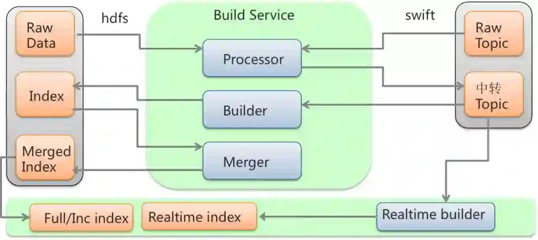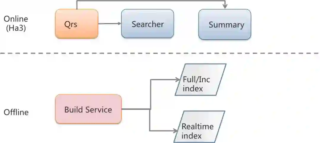 我们把索引数据的生成过程称作离线过程。Ha3的索引是通过搜索团队开发的Build Service系统生成的。