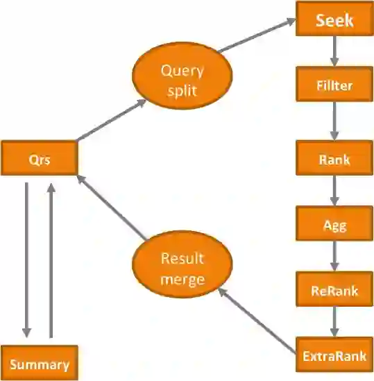 Qrs上的查询逻辑相对于Searcher来说比较简单。一次完整的查询分为两个阶段:一阶段与二阶段。一阶段Qrs会向一个完整行的多列Searcher发送请求,从多列Searcher中拿到结果后作合并与排序,而二阶段则是将排序后,前N个文档(这里的N由用户指定)的docid或者primary_key拼到查询串中,送回给Searcher作摘要(Summary)查询,拿到多列摘要(Summary)结果后再做一次结果合并,返回给用户