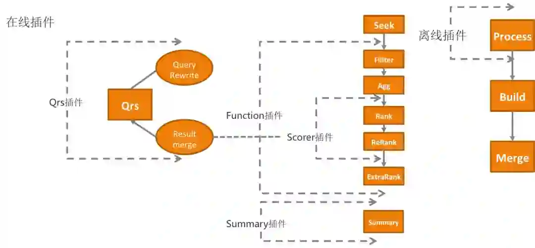 为了实现业务的可定制化,Ha3提供了插件机制。在前文介绍的离线和在线流程的各个环节中,Ha3用户可以通过开发自己的插件,对原始文档、查询Query、召回、算分、排序、摘要做业务上所期望的修改。