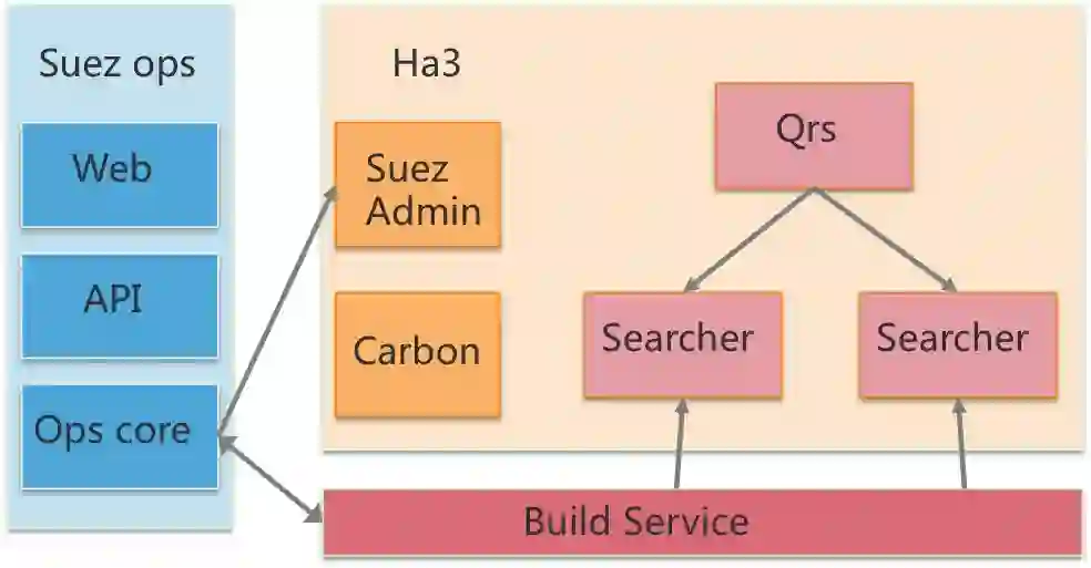 suez admin:这是一个承上启下的角色。用户通过suez_ops的操作提交自己的运维需求,ha3 admin拿到更新信息后,将更新目标分解,发给自己管理的Qrs或Searcher worker,具体的变更行为由Qrs或Searcher进程自己完成