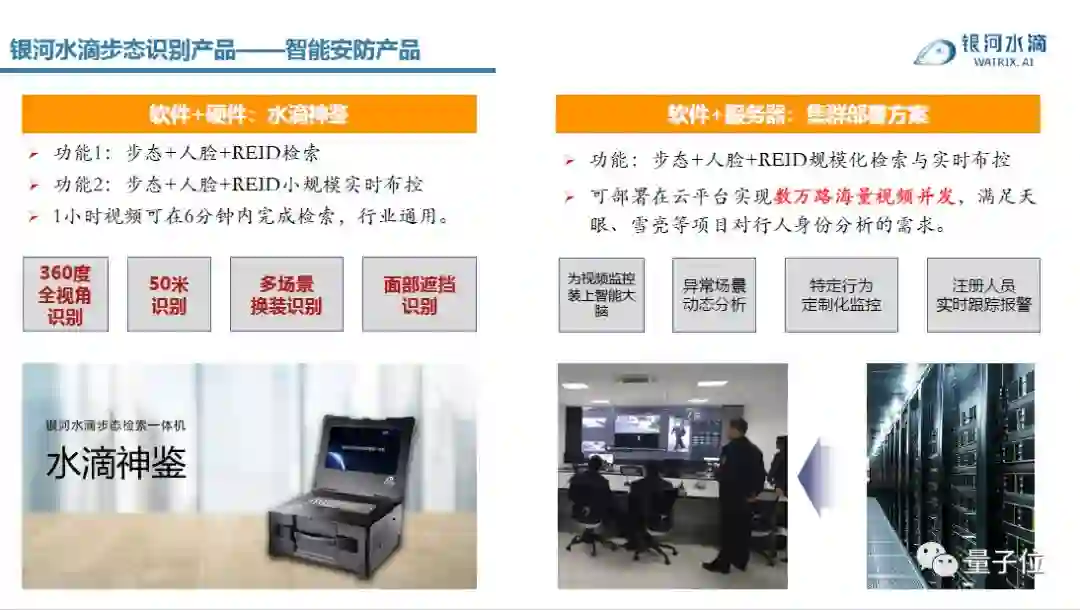 步态识别,水滴现在能够做到的最远识别距离是50米,而且是360度全视角识别,不管人是从什么方向走过来,都可以识别;即使光照有变化,或者说穿的衣服有变化,甚至把面部挡住都没有关系,都可以被识别。另外步态识别也不需要被识别人的主动配合,用户体验更加友好。
