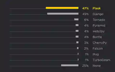 Flask 和 Django 是 Web 开发人员中最受欢迎的框架,占比相同(约 45%),把其他 Python Web 框架远远甩在后面。