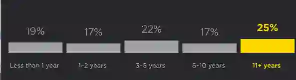 与 2017 年相比,Python 用户在 IT 行业的经验更加多样化,没有特别占优势的群体,其中拥有 11 年以上经验的用户占比最大(25%),其次为 3-5 年经验(22%),小于一年(19%)。