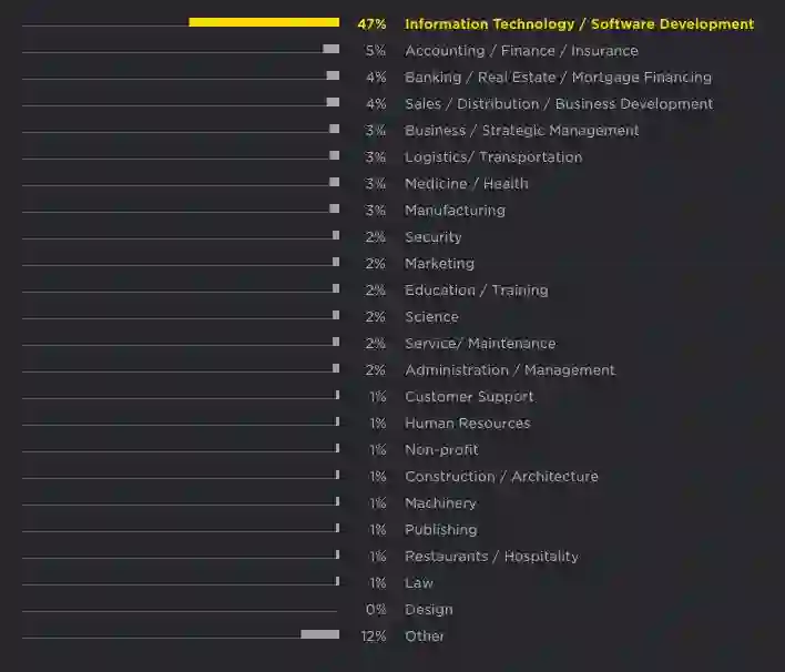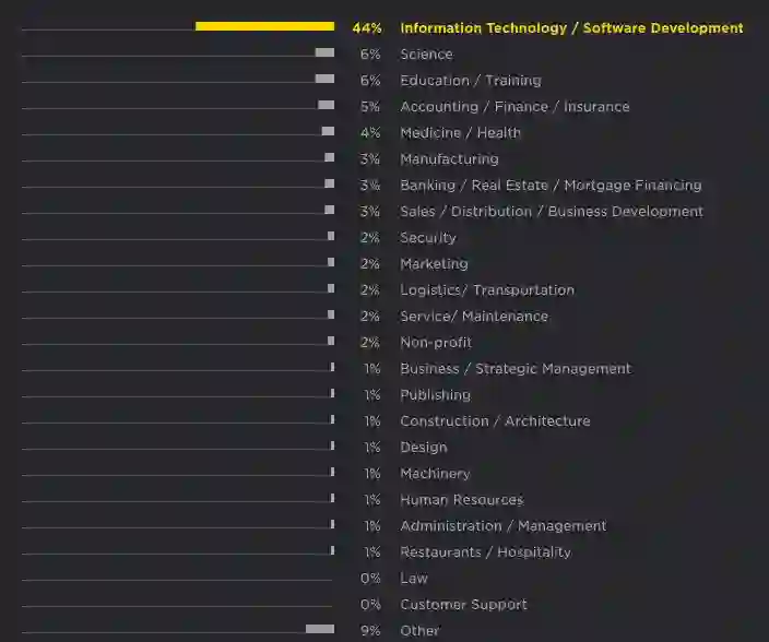 信息技术 / 软件开发占比最大,为 44%;“其他”一列中包括零售、能源和媒体。
